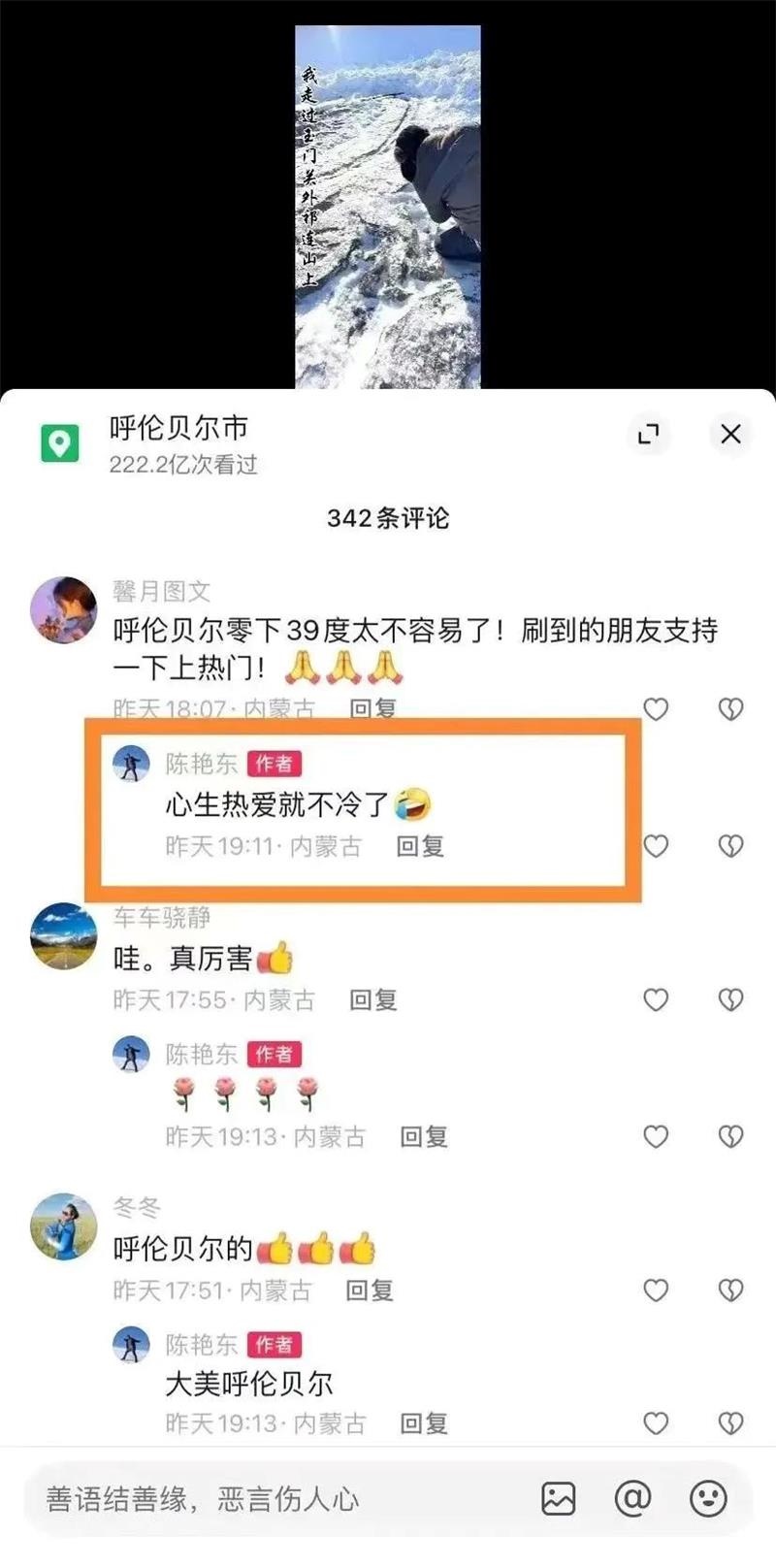 而他回復:“心生熱愛就不冷了”