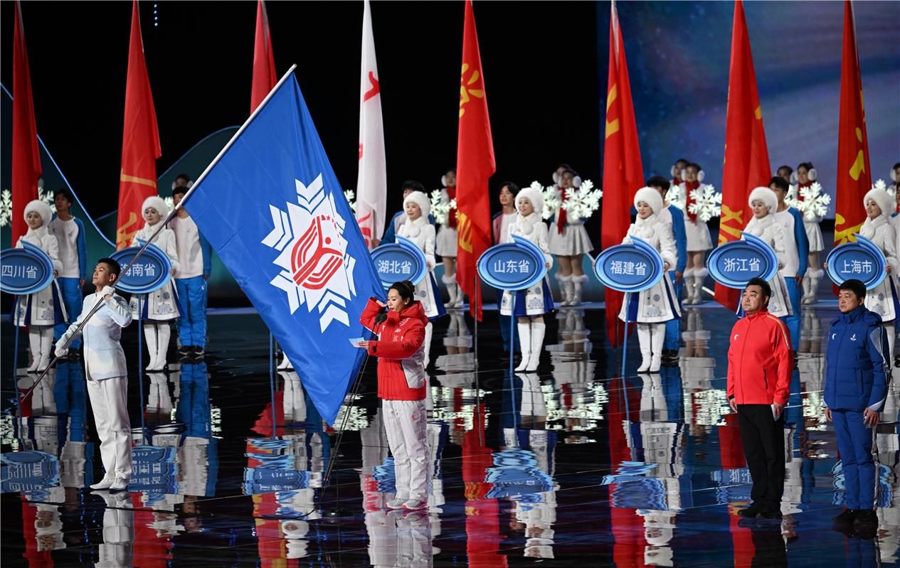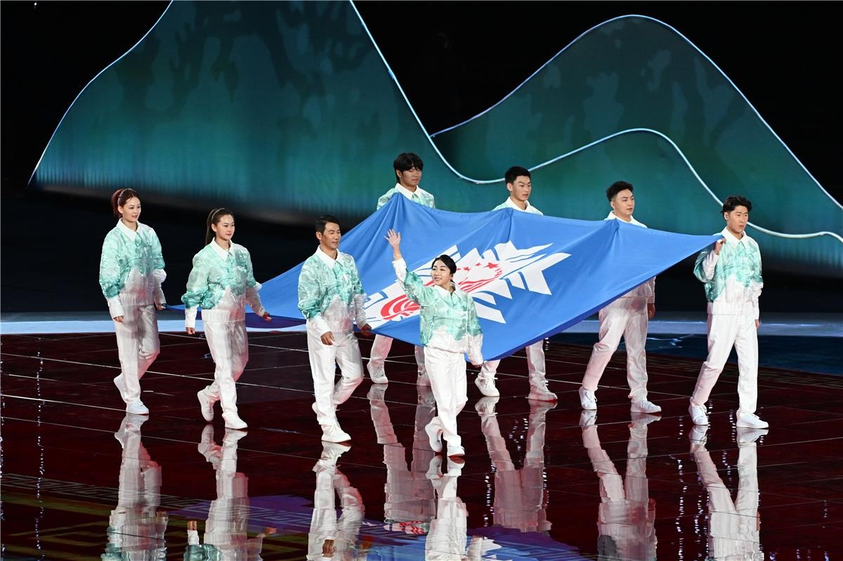 中華人民共和國(guó)第十四屆冬季運(yùn)動(dòng)會(huì)會(huì)旗入場(chǎng)。