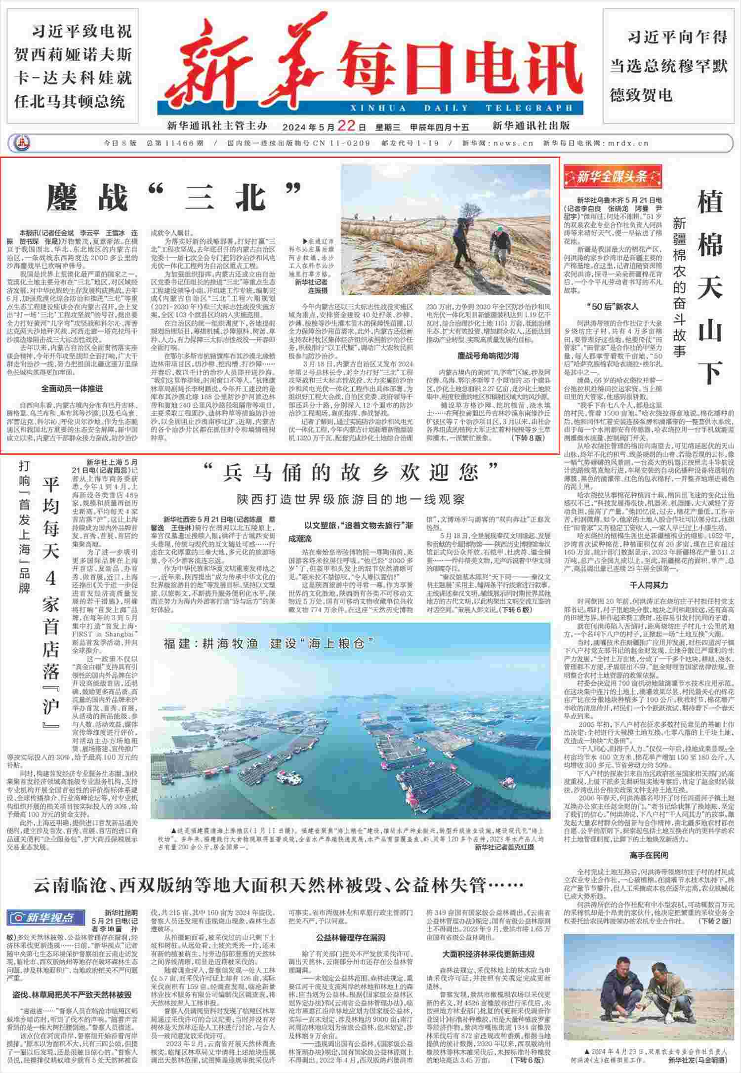 2024年5月22日,《新華每日電訊》頭版頭條刊發(fā)《鏖戰(zhàn)“三北”》,文章報(bào)道了我國(guó)是世界上荒漠化最嚴(yán)重的國(guó)家之一,荒漠化土地主要分布在“三北”地區(qū),對(duì)區(qū)域經(jīng)濟(jì)發(fā)展,對(duì)中華民族的生存發(fā)展構(gòu)成挑戰(zhàn)。在橫亙于我國(guó)西北、華北、東北地區(qū)的內(nèi)蒙古自治區(qū),一條戰(zhàn)線東西跨度達(dá)2000多公里的沙海鏖戰(zhàn)早已吹響沖鋒號(hào)。
