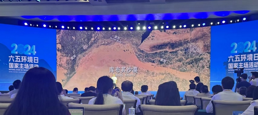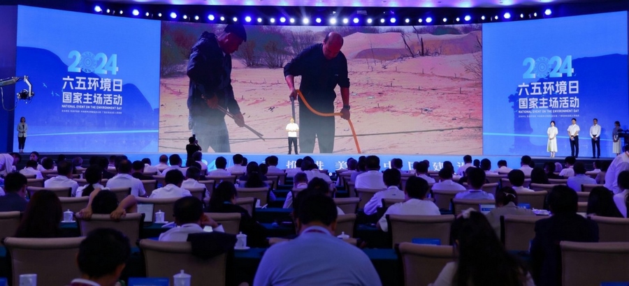 當(dāng)天在廣西南寧,生態(tài)環(huán)境部、中央文明辦、廣西壯族自治區(qū)人民政府聯(lián)合舉辦了2024年六五環(huán)境日國家主場活動。建設(shè)美麗中國,是實現(xiàn)中華民族偉大復(fù)興中國夢的重要內(nèi)容。在習(xí)近平生態(tài)文明思想指引下,一個人與自然和諧共生的美麗中國正從藍圖變?yōu)楝F(xiàn)實?;顒犹貏e設(shè)立了“從這里看見美麗中國”主題展示環(huán)節(jié),從全國各地的案例中遴選了6個“美麗中國建設(shè)創(chuàng)新示范案例”,內(nèi)蒙古杭錦旗庫布其沙漠億利生態(tài)示范區(qū)“綠水青山就是金山銀山”實踐創(chuàng)新基地作為唯一的“兩山”基地案例在活動現(xiàn)場進行了展示。來自億利資源集團的庫布其治沙工程師田旺應(yīng)邀參加活動,他結(jié)合親身經(jīng)歷,向全球嘉賓介紹了政府、企業(yè)、農(nóng)牧民合力治理庫布其沙漠三十多年,在生態(tài)文明思想引領(lǐng)下將“死亡之海”建設(shè)成為生命綠洲的生動故事。