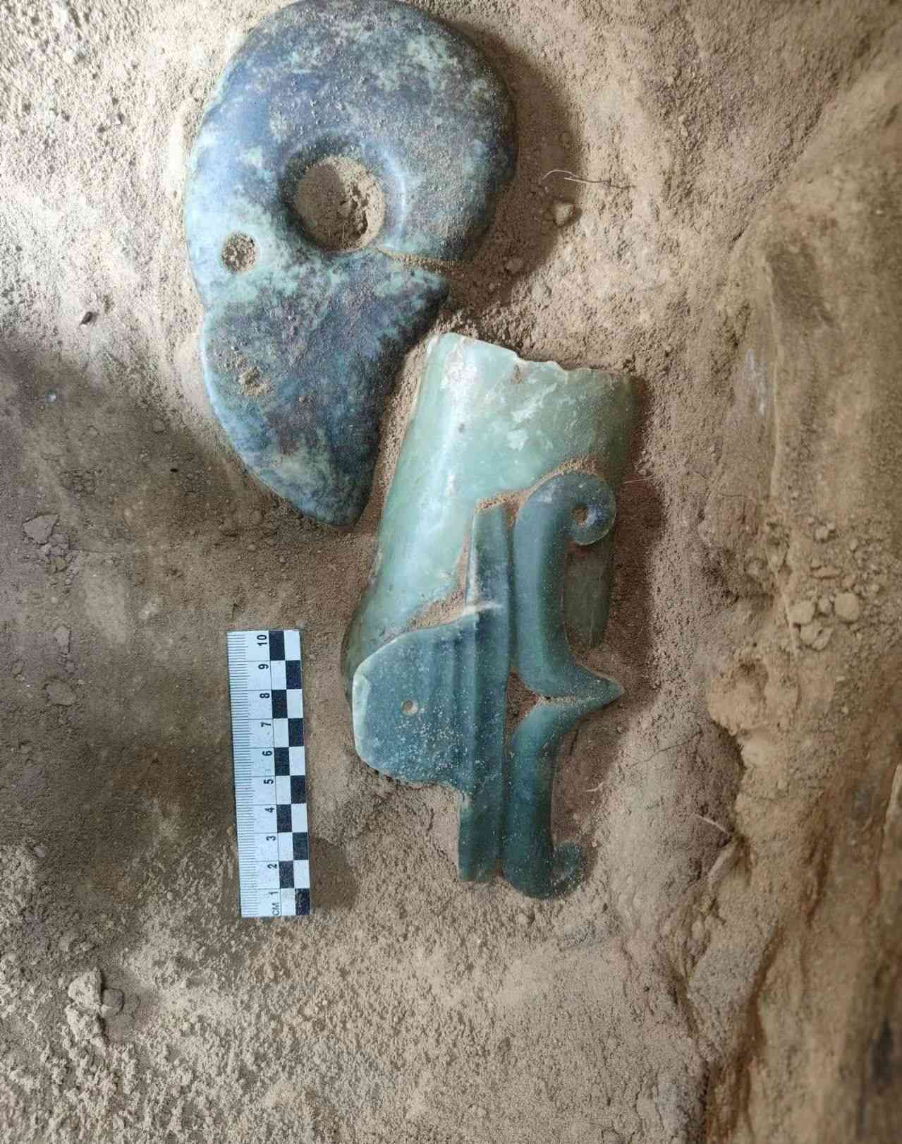 出土器物以無底筒形器和玉石器為主,其它也見打制石器、細(xì)石葉、蚌貝類及骨器等。生活用陶極少。玉石器此次共計(jì)百余件,種類有環(huán)、璧、方璧、璜、斧、鑿、錐、鉞、蠶、蟬、龍以及各類鉆芯、玉料、切割的廢料等。對(duì)出土玉器的初步研究發(fā)現(xiàn),祭祀用玉和墓葬內(nèi)的葬玉存在顯著差異,前者材差且殘但器型豐富,數(shù)量較多。而墓葬內(nèi)用玉則料美工精,不乏重器。