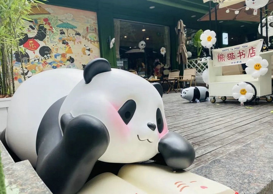 在熊貓書(shū)店萌新之時(shí),以軒小樂(lè)形象制作了兩只雕塑,源源不斷吸引著本地讀者與外地游客前往拍照打卡。一只站在店門(mén)口,撐著橙色小傘,笑臉盈盈地迎接著南來(lái)北往的朋友。一只則趴在室外休閑區(qū),安靜地翻看著書(shū)頁(yè)。