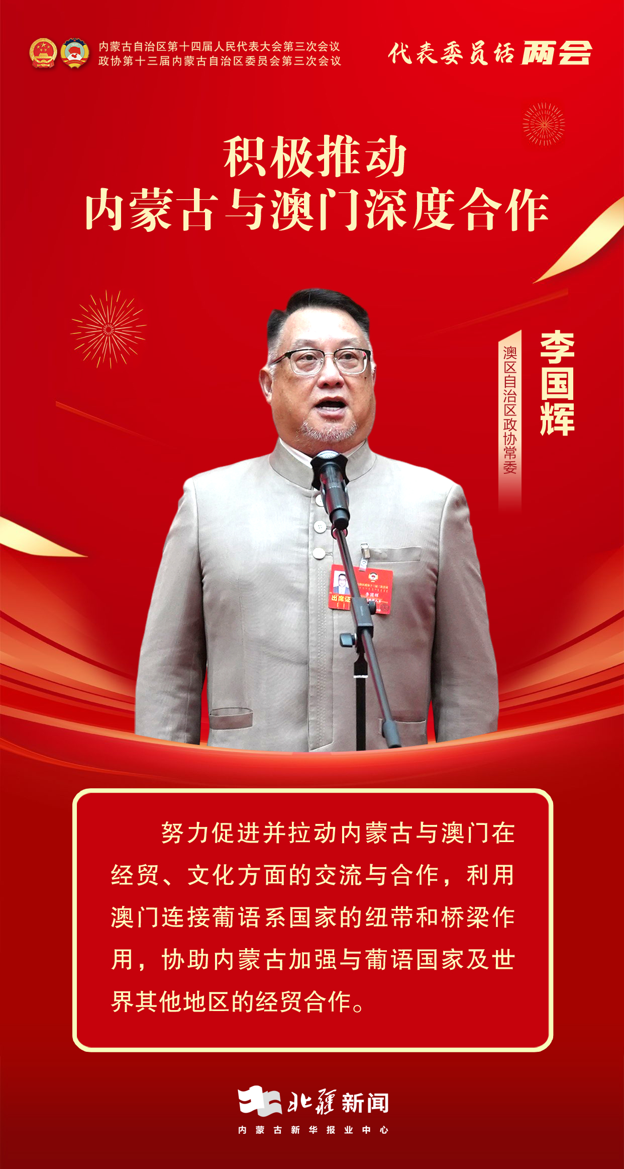 內(nèi)蒙古經(jīng)濟社會的發(fā)展取得翻天覆地的變化,內(nèi)蒙古的各項事業(yè)蓬勃發(fā)展。作為政協(xié)委員的李國輝,他將努力促進并拉動內(nèi)蒙古與澳門在經(jīng)貿(mào)方面、文化方面的交流與合作,利用澳門連接葡語系國家的紐帶和橋梁作用,協(xié)助內(nèi)蒙古加強與葡語國家及世界其他地區(qū)的經(jīng)貿(mào)合作。同時,推動內(nèi)蒙古與澳門在旅游、會展、金融等領(lǐng)域的深度合作,實現(xiàn)資源分享、優(yōu)勢互補。