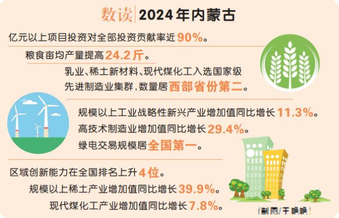 新賽道上,受益于高質(zhì)量重大項目帶動,2024年,自治區(qū)綠電交易規(guī)模居全國第一;“蒙科聚”平臺技術(shù)合同成交額同比增長33.6%,全區(qū)凈增科技型中小企業(yè)853家、高新技術(shù)企業(yè)97家、科技領(lǐng)軍企業(yè)20家,乳業(yè)、稀土、氫、儲等領(lǐng)域取得一批填補行業(yè)空白的技術(shù)突破,我區(qū)區(qū)域創(chuàng)新能力在全國排名上升4位;全區(qū)規(guī)模以上新能源及相關(guān)產(chǎn)業(yè)增加值同比增長20.1%,規(guī)模以上工業(yè)戰(zhàn)略性新興產(chǎn)業(yè)增加值同比增長11.3%,高技術(shù)制造業(yè)增加值同比增長29.4%……推動新興產(chǎn)業(yè)“強筋壯骨”、未來產(chǎn)業(yè)加速培育,內(nèi)蒙古落子如飛!