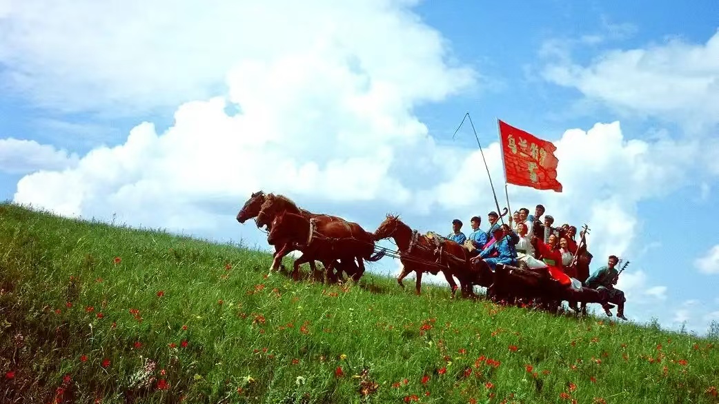 1957年6月17日,內(nèi)蒙古第一支烏蘭牧騎在錫林郭勒盟蘇尼特右旗成立。成立第二天,9名隊(duì)員帶著兩塊幕布、三盞煤油燈、五件樂(lè)器,舉著紅旗,甩著響鞭,坐著馬車,向偏遠(yuǎn)的牧區(qū)進(jìn)發(fā)。