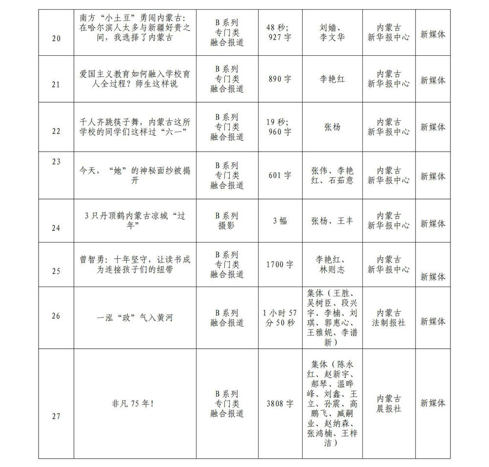 按照新聞獎評選辦法要求,內(nèi)蒙古新華報業(yè)中心現(xiàn)對擬報送第33屆內(nèi)蒙古新聞獎暨第35屆中國新聞獎參評作品進行公示,歡迎社會各界監(jiān)督、評議。