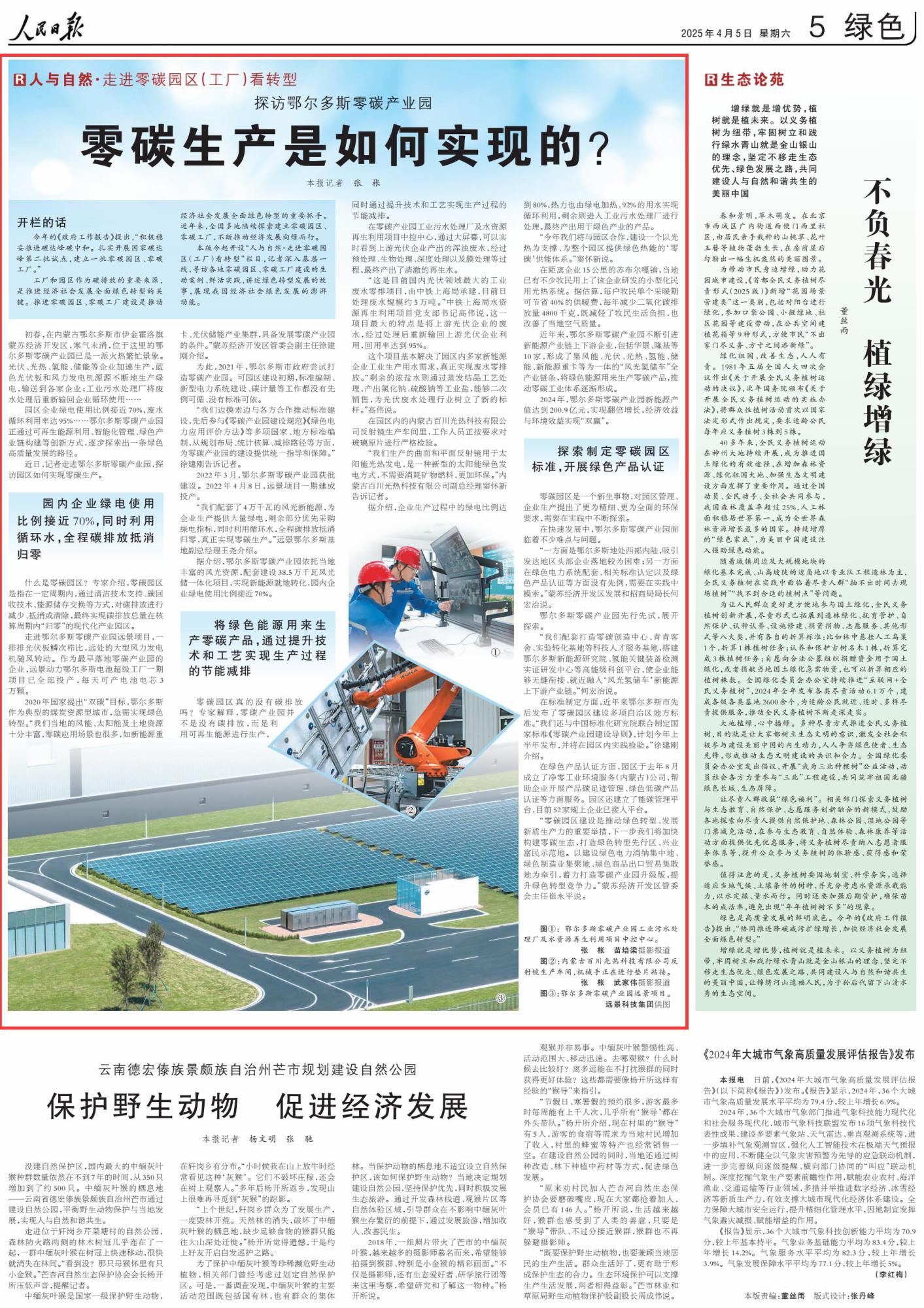2025年4月5日,《人民日?qǐng)?bào)》第5版刊發(fā)題為《探訪鄂爾多斯零碳產(chǎn)業(yè)園 零碳生產(chǎn)是如何實(shí)現(xiàn)的?》的文章,報(bào)道了鄂爾多斯零碳產(chǎn)業(yè)園通過可再生能源利用、智能化管理、綠色產(chǎn)業(yè)鏈構(gòu)建等創(chuàng)新方式,逐步探索出一條綠色高質(zhì)量發(fā)展的路徑。