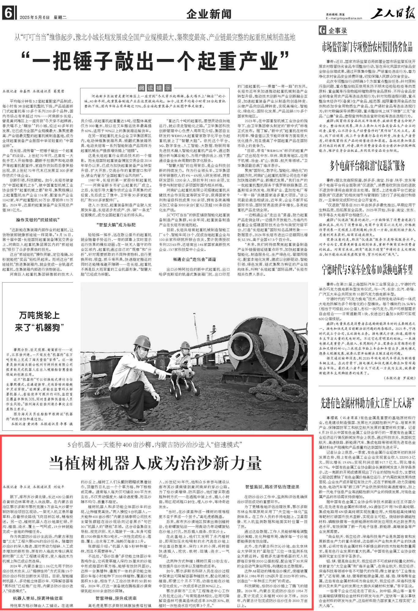 2025年5月6日,《工人日報》第6版刊發(fā)題為《當(dāng)植樹機器人成為治沙新力量》的文章,報道了內(nèi)蒙古作為我國防沙治沙主戰(zhàn)場,承擔(dān)著“三北”工程六期60%的治沙任務(wù)。隨著防沙治沙的深入推進(jìn),智能植樹機器人、多功能立體固沙車、可降解容器等“黑科技”已經(jīng)推廣應(yīng)用,內(nèi)蒙古防沙治沙進(jìn)入“倍速模式”。