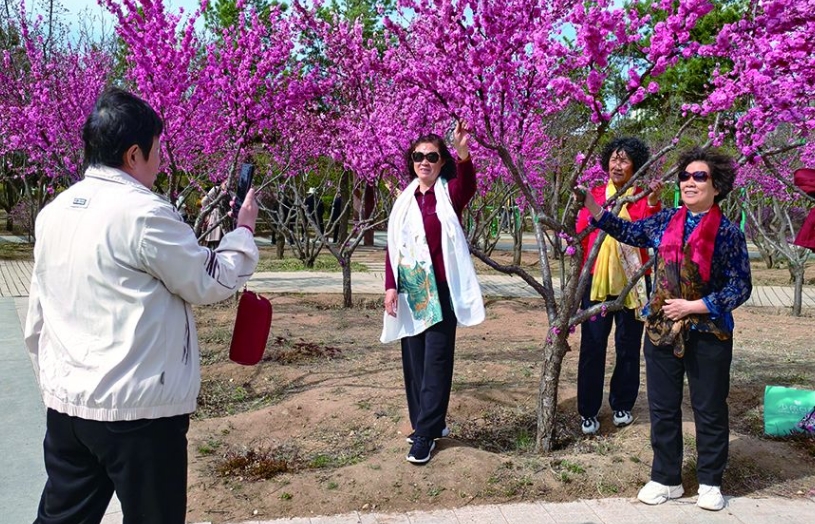 走進植物園,道路兩側(cè)的榆葉梅競相綻放,粉紅色的花朵層層疊疊掛滿枝頭,形成一片爛漫花海。從浙江來的游客李筱正用手機記錄美景:“原本擔心錯過北方花期,沒想到這里的榆葉梅開得這么漂亮,完全不輸江南的春天。”