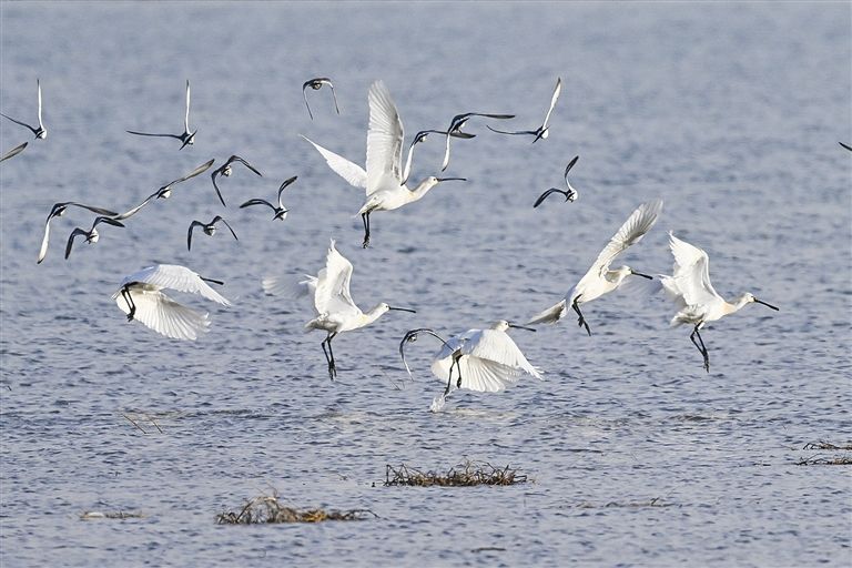 包頭市土右旗黃河濕地,鵜鶘、鳳頭鸊鷉、白鷺、紅嘴鷗等眾多候鳥正在覓食游弋飛翔棲息。本報記者 王曉博 攝