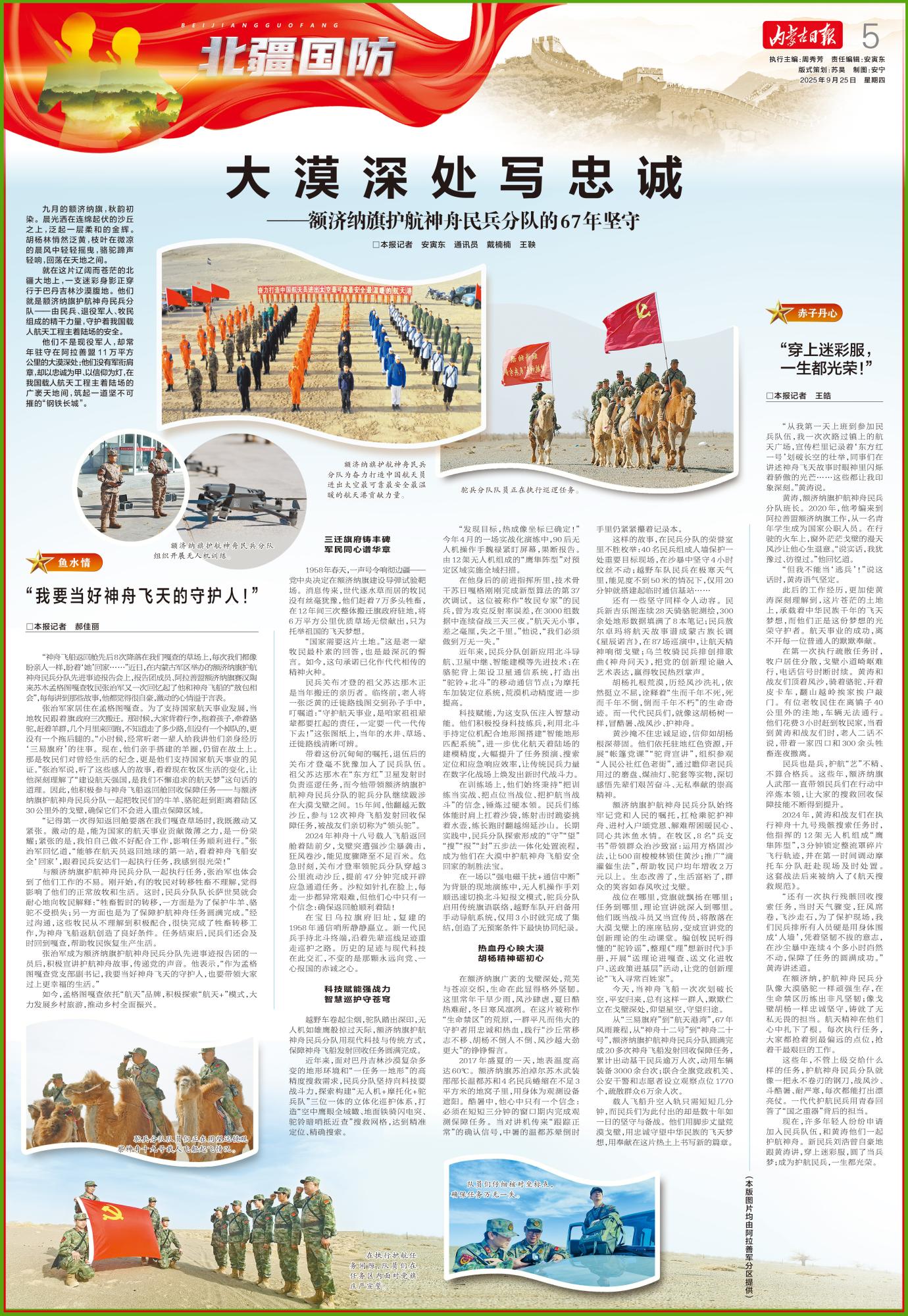 額濟(jì)納旗護(hù)航神舟民兵分隊(duì)始終牢記黨和人民的囑托,扛槍乘駝護(hù)神舟、進(jìn)村入戶頌黨恩、解難幫困暖民心、同心共沐魚水情。在牧區(qū),8名“兵支書”帶領(lǐng)群眾治沙致富:運(yùn)用方格固沙法,讓500畝梭梭林鎖住黃沙;推廣“滴灌催生法”,幫助牧民戶均年增收2萬元以上。生態(tài)改善了,生活富裕了,群眾的笑容如春風(fēng)吹過戈壁。
