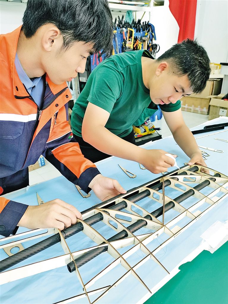 內(nèi)蒙古工業(yè)大學(xué)智能裝備研究院工作人員正在進行TS300長航時大載重固定翼無人運輸機室內(nèi)組裝工作。