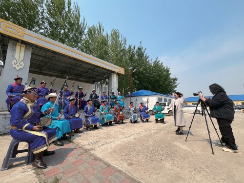 5月21日,記者走進吐列毛杜鎮(zhèn)鐵特格嘎查,恰巧遇到鎮(zhèn)黨委宣傳委員高薩日娜正在拍攝最新一期的《村聞聯(lián)播》。嘎查小舞臺上,17名村民身著蒙古族服飾,手持四胡演奏著《烏力格爾三部曲》《牧民歌唱共產(chǎn)黨》等悠揚的樂曲。他們大部分年齡都在五六十歲,來自當?shù)氐睦ざ祭渌暮鷧f(xié)會。該協(xié)會共有60余名會員,多年來以四胡彈奏、科爾沁民歌、烏力格爾(一種蒙古族的曲藝說書形式)、好來寶說唱等各種方式,參與著吐列毛杜鎮(zhèn)文化志愿服務(wù)。