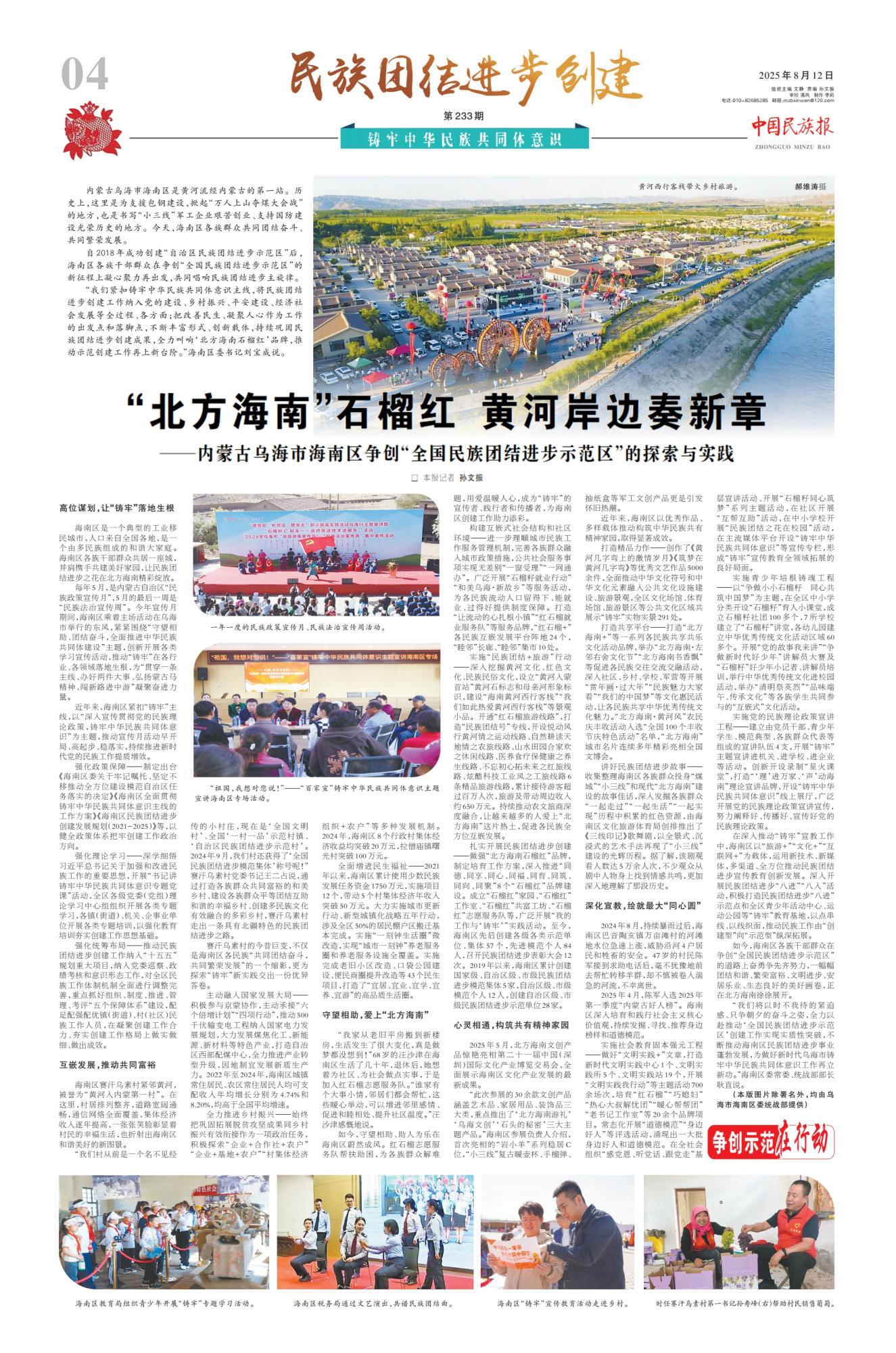 2025年8月12日,《中國民族報》第4版刊發(fā)整版文章《“北方海南”石榴紅 黃河岸邊奏新章——內蒙古烏海市海南區(qū)爭創(chuàng)“全國民族團結進步示范區(qū)”的探索與實踐》,報道了自2018年成功創(chuàng)建“自治區(qū)民族團結進步示范區(qū)”后,內蒙古烏海市海南區(qū)各族干部群眾在爭創(chuàng)“全國民族團結進步示范區(qū)”的新征程上凝心聚力再出發(fā),共同唱響民族團結進步主旋律。