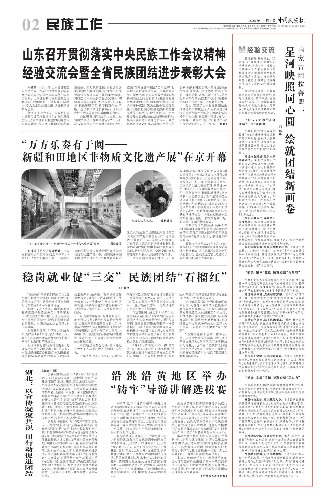 2025年11月4日,《中國民族報》第2版刊發(fā)題為《內蒙古阿拉善盟:星河映照同心圓 繪就團結新畫卷》的文章,報道了伴隨著各族群眾的歡呼吶喊,神舟二十一號載人飛船在位于內蒙古自治區(qū)阿拉善盟額濟納旗境內的東風航天城成功發(fā)射。璀璨烈焰照亮北疆夜空,映照出各族群眾手拉手、心連心的團結身影。