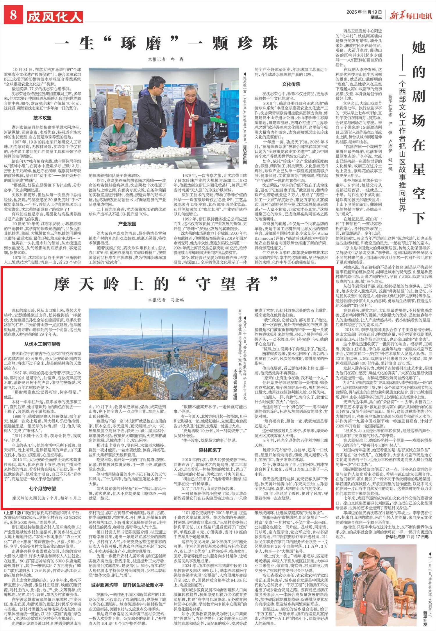 2025年11月19日,《新華每日電訊》第8版刊發(fā)題為《摩天嶺上的“守望者”》的文章,報(bào)道了摩天嶺位于內(nèi)蒙古呼倫貝爾市牙克石市綽河源鎮(zhèn)西南40公里處,是大興安嶺嶺南的第二高峰。火情瞭望員孫忠全站在瞭望塔頂,雙手扶著冰涼的欄桿,目光沿著山勢一點(diǎn)點(diǎn)延展。他舉起望遠(yuǎn)鏡,搜尋著山坳深處的每一個(gè)角落。這已是他在摩天嶺守望的第29個(gè)年頭。