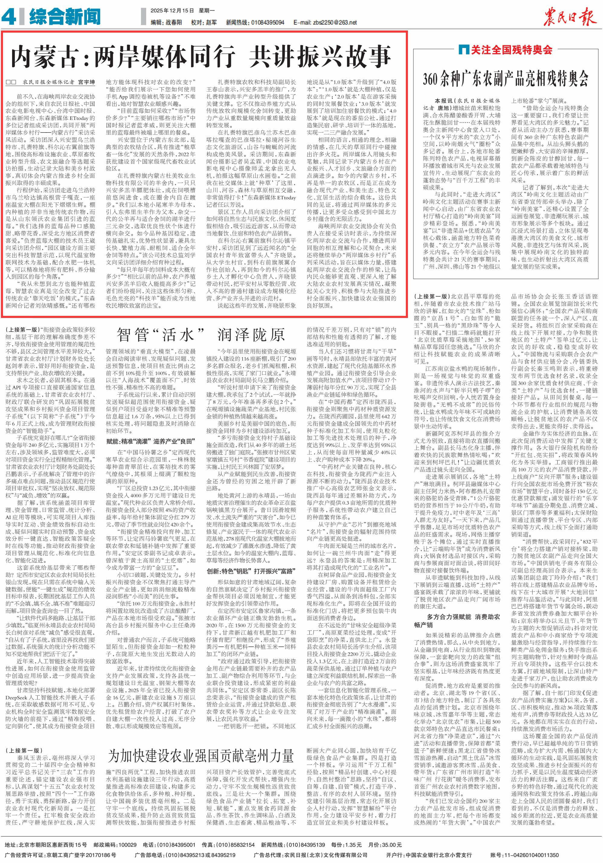 2025年12月15日《農民日報》第4版刊發(fā)了《內蒙古:兩岸媒體同行 共講振興故事》的文章,報道了前不久,在海峽兩岸農業(yè)交流協(xié)會的組織下,來自農民日報社、中國農業(yè)電影電視中心、臺灣中國時報、東森新聞臺、東森新媒體ETtoday的多位記者組成采訪團,共同開展“兩岸媒體鄉(xiāng)村行——內蒙古行”采訪采風活動。兩岸媒體人用鏡頭和筆觸,共同記錄下內蒙古鄉(xiāng)村在產業(yè)振興、人才回鄉(xiāng)、文旅融合方面的點滴進步。這份共同的見證,將通過兩岸媒體的多元傳播,讓更多受眾感受到中國北方鄉(xiāng)村蘊含的無限活力。