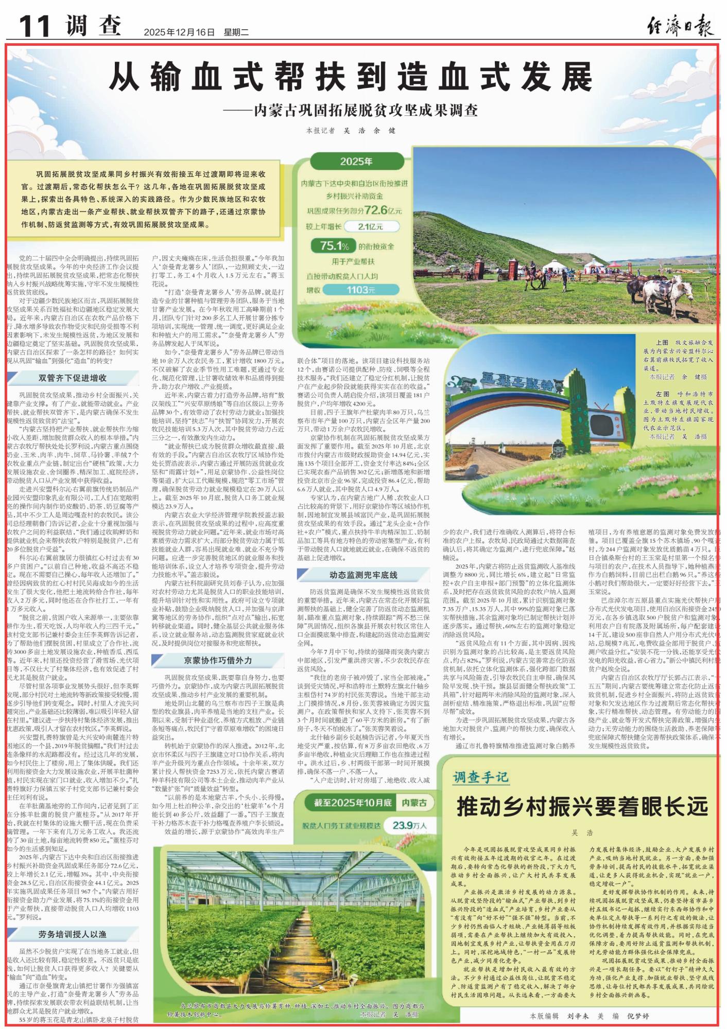 2025年12月16日,《經(jīng)濟(jì)日?qǐng)?bào)》第11版刊發(fā)題為《從輸血式幫扶到造血式發(fā)展——內(nèi)蒙古鞏固拓展脫貧攻堅(jiān)成果調(diào)查》的文章,報(bào)道了鞏固拓展脫貧攻堅(jiān)成果同鄉(xiāng)村振興有效銜接五年過渡期即將迎來收官。作為少數(shù)民族地區(qū)和農(nóng)牧地區(qū),內(nèi)蒙古走出一條產(chǎn)業(yè)幫扶、就業(yè)幫扶雙管齊下的路子,還通過京蒙協(xié)作機(jī)制、防返貧監(jiān)測等方式,有效鞏固拓展脫貧攻堅(jiān)成果。