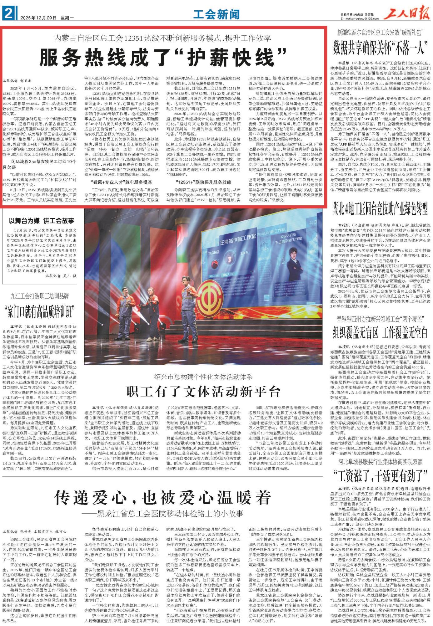 2025年12月29日,《工人日?qǐng)?bào)》第2版刊發(fā)題為《服務(wù)熱線成了“護(hù)薪快線”》的文章,報(bào)道了內(nèi)蒙古自治區(qū)總工會(huì)12351熱線開通兩年以來,傾聽職工心聲、化解勞動(dòng)糾紛,成為維護(hù)職工合法權(quán)益的“暖心橋”和“維權(quán)盾”。其中,熱線共受理零散農(nóng)民工欠薪投訴738起,為上千名農(nóng)民工追回欠薪。