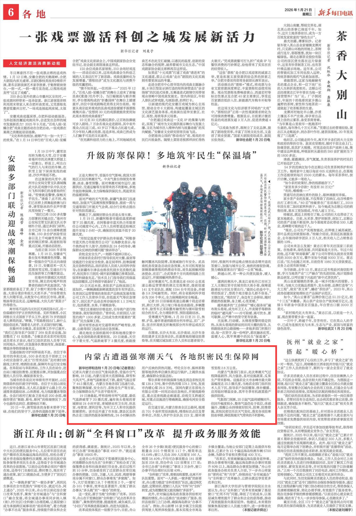 2026年1月21日《新華每日電訊》第6版刊發(fā)了《內(nèi)蒙古遭遇強寒潮天氣 各地織密民生保障網(wǎng)》的文章,報道了內(nèi)蒙古迎來大范圍降溫、降雪和大風(fēng)天氣,多地氣溫斷崖式下跌,最低氣溫達(dá)零下44.5攝氏度。各地各部門迅速行動,聚焦防寒保暖、安全出行、農(nóng)牧業(yè)生產(chǎn)等方面,全力保障群眾生產(chǎn)生活平穩(wěn)有序。