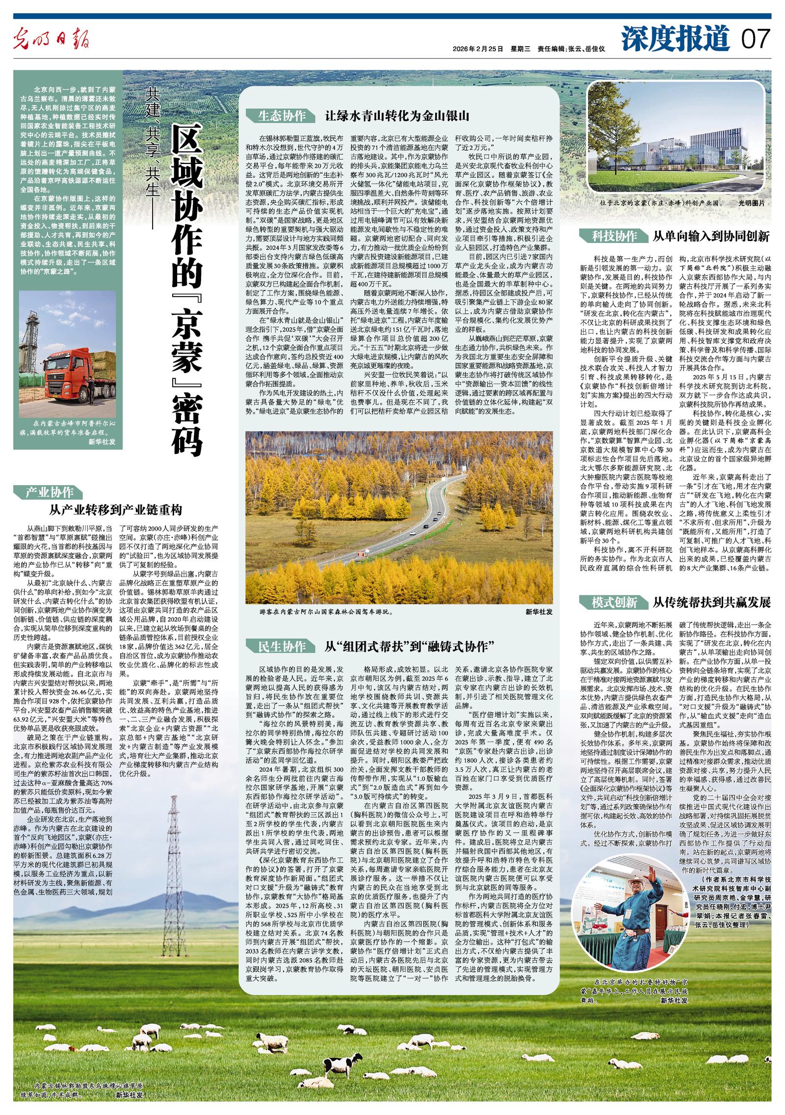 2026年2月25日《光明日報》第7版整版刊發(fā)了《共建、共享、共生——區(qū)域協(xié)作的“京蒙”密碼》的文章,報道了聚焦民生福祉,夯實協(xié)作根基。京蒙協(xié)作始終將保障和改善民生作為出發(fā)點和落腳點,通過精準對接群眾需求,推動優(yōu)質(zhì)資源對接、共享,努力提升人民的幸福感、獲得感,通過改善民生凝聚人心。