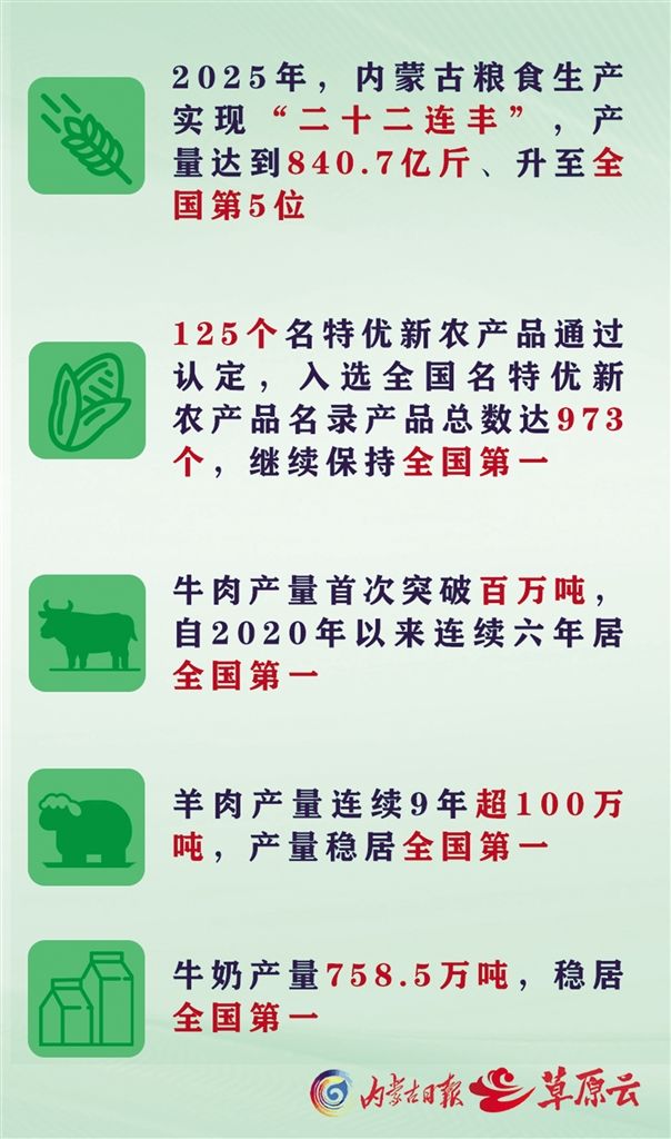 從河套平原的繁忙備耕到錫林郭勒草原的牛羊成群,再到敕勒川的奶香四溢,內(nèi)蒙古以“糧倉(cāng)”更實(shí)、“肉庫(kù)”更足、“奶罐”更豐的堅(jiān)實(shí)底氣,扛起建設(shè)國(guó)家重要農(nóng)畜產(chǎn)品生產(chǎn)基地的使命擔(dān)當(dāng)。