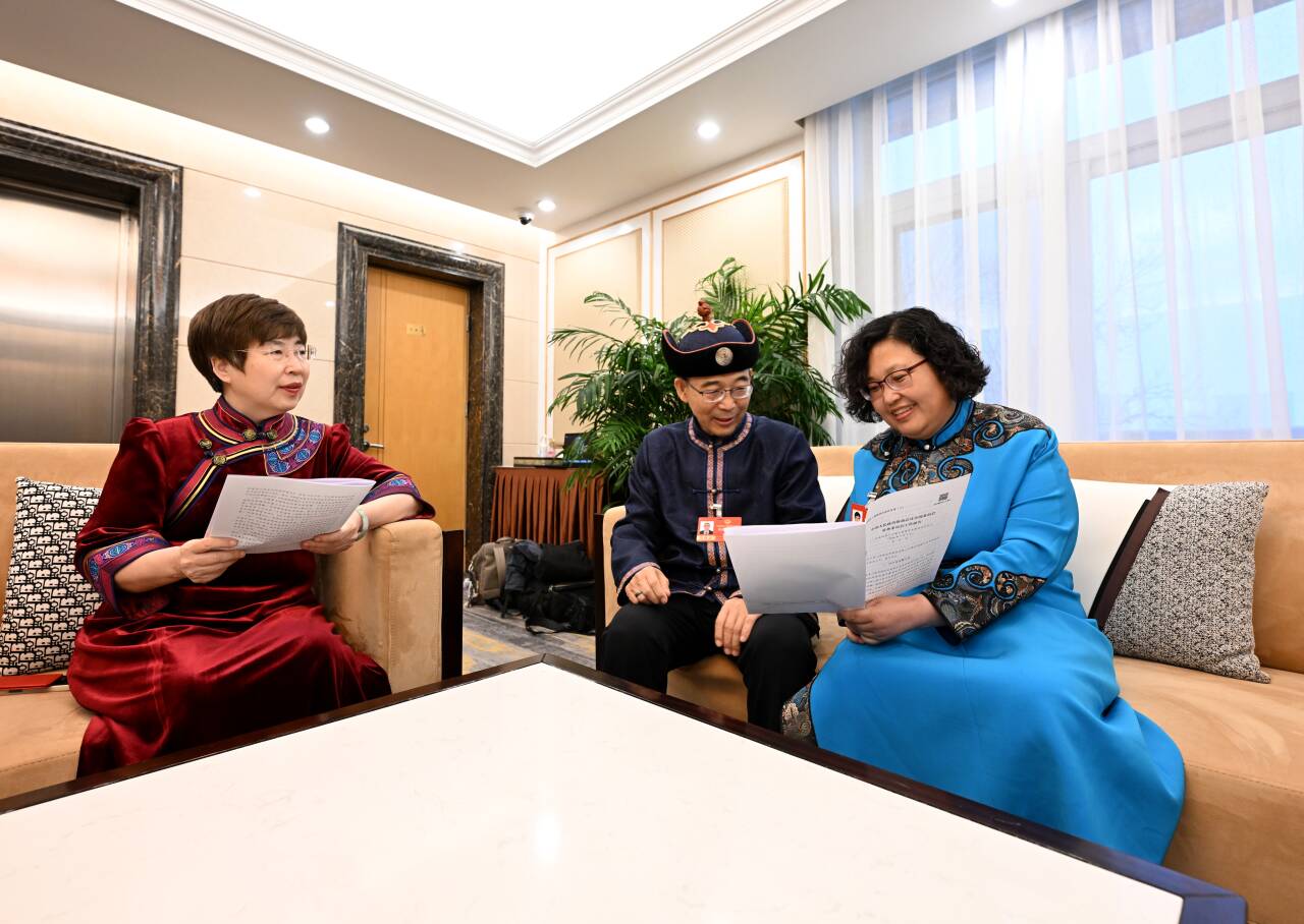 3月4日,住內(nèi)蒙古全國政協(xié)委員杜明燕(右)、納日碧力戈(中)、鄂曉梅(左)就全國政協(xié)常委會工作報告中共同關(guān)注的話題進(jìn)行交流。草原云記者 韓卿立