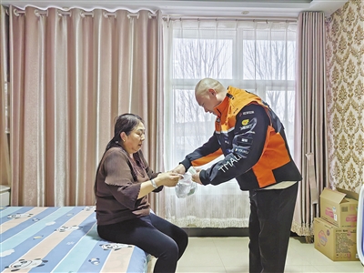 快遞員為社區(qū)居民上門送藥。(化德縣委社會工作部供圖)
