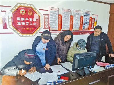 臨河區(qū)綜治中心特邀政協(xié)委員調(diào)解員化解糾紛。 王震 攝