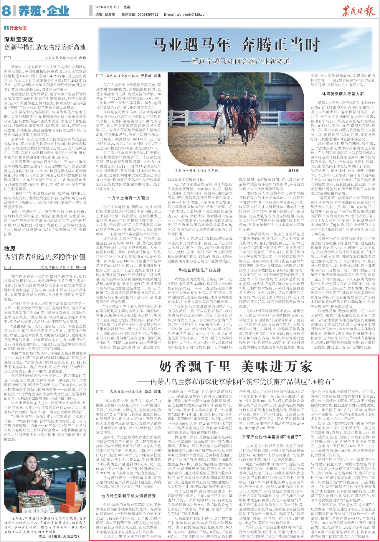 2026年3月11日,《農(nóng)民日報》第8版刊發(fā)題為《奶香飄千里 美味進萬家——內(nèi)蒙古烏蘭察布市深化京蒙協(xié)作筑牢優(yōu)質(zhì)畜產(chǎn)品供應(yīng)“壓艙石”》的文章,報道了內(nèi)蒙古烏蘭察布市是世界公認的畜牧業(yè)“黃金產(chǎn)業(yè)帶”,也是距離北京最近的草原牧區(qū),面向北京超2000萬居民的超大體量畜產(chǎn)品消費需求,農(nóng)畜產(chǎn)品銷售正是京蒙協(xié)作框架“六個倍增計劃”中的重要內(nèi)容。