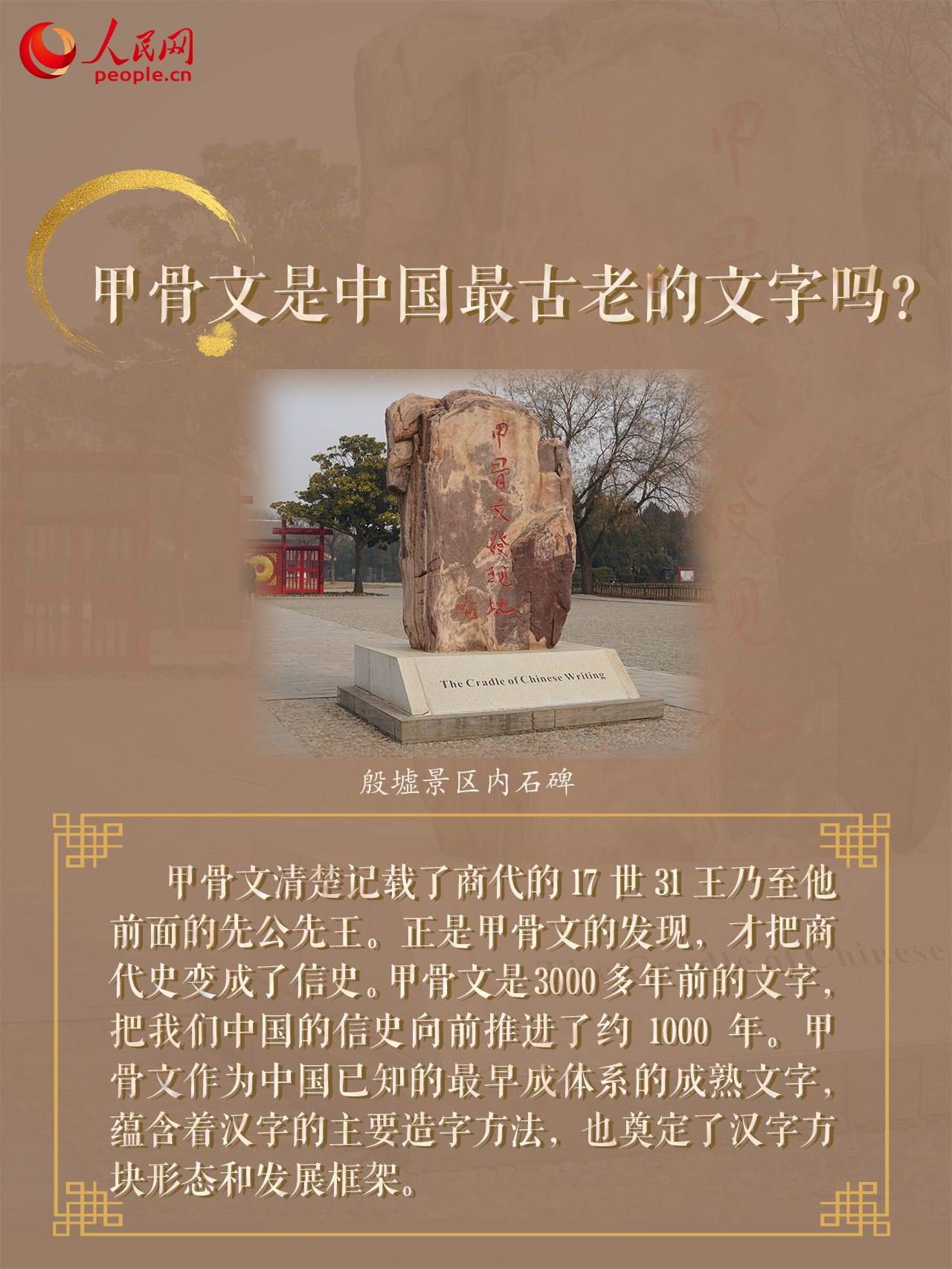 近日,由中央網(wǎng)信辦網(wǎng)絡(luò)傳播局指導(dǎo)的“寫意中國——探尋漢字起源”網(wǎng)上主題宣傳活動(dòng)正在開展。記者走進(jìn)位于河南安陽的殷墟遺址,一眼閱盡千年,探尋中華文明的古老密碼,感受遠(yuǎn)古甲骨文的獨(dú)特魅力。常說的“一片甲骨驚天下”指的是什么?什么地方被學(xué)術(shù)界譽(yù)為“中國最早的圖書館”?中國歷史上第一位巾幗女將軍是誰?跟隨記者實(shí)地探訪,一起來了解殷墟的文化密碼!