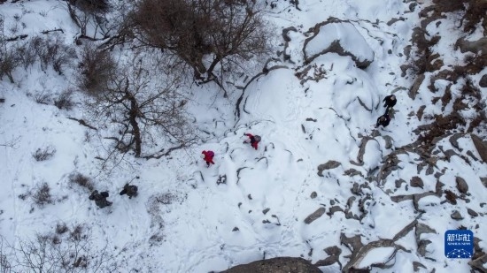 2月20日,在內(nèi)蒙古賀蘭山國家級自然保護區(qū),工作人員在山間跋涉(無人機照片)。
