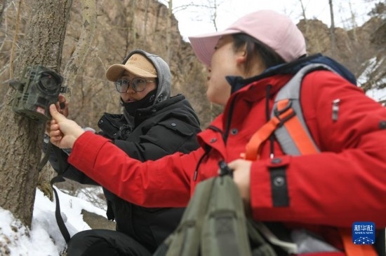 2月20日,在內(nèi)蒙古賀蘭山國家級自然保護區(qū),工作人員阿麗瑪(左)和徐皓在布設(shè)紅外相機。