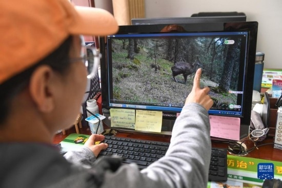 2月20日,在內(nèi)蒙古賀蘭山國家級自然保護區(qū)管理局,工作人員阿麗瑪展示紅外相機拍攝到的國家一級保護動物馬麝。