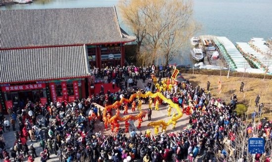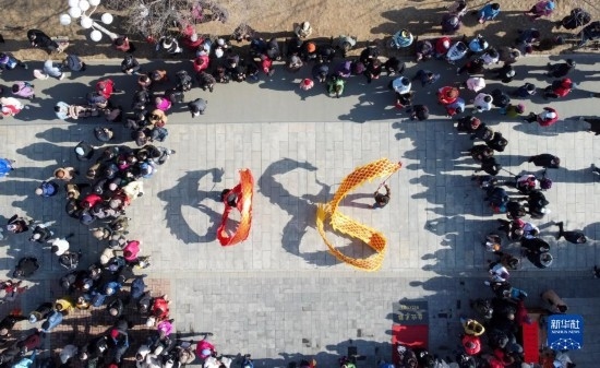 2月21日,在天津市水上公園,民間藝人表演空竹舞龍(無人機(jī)照片)。