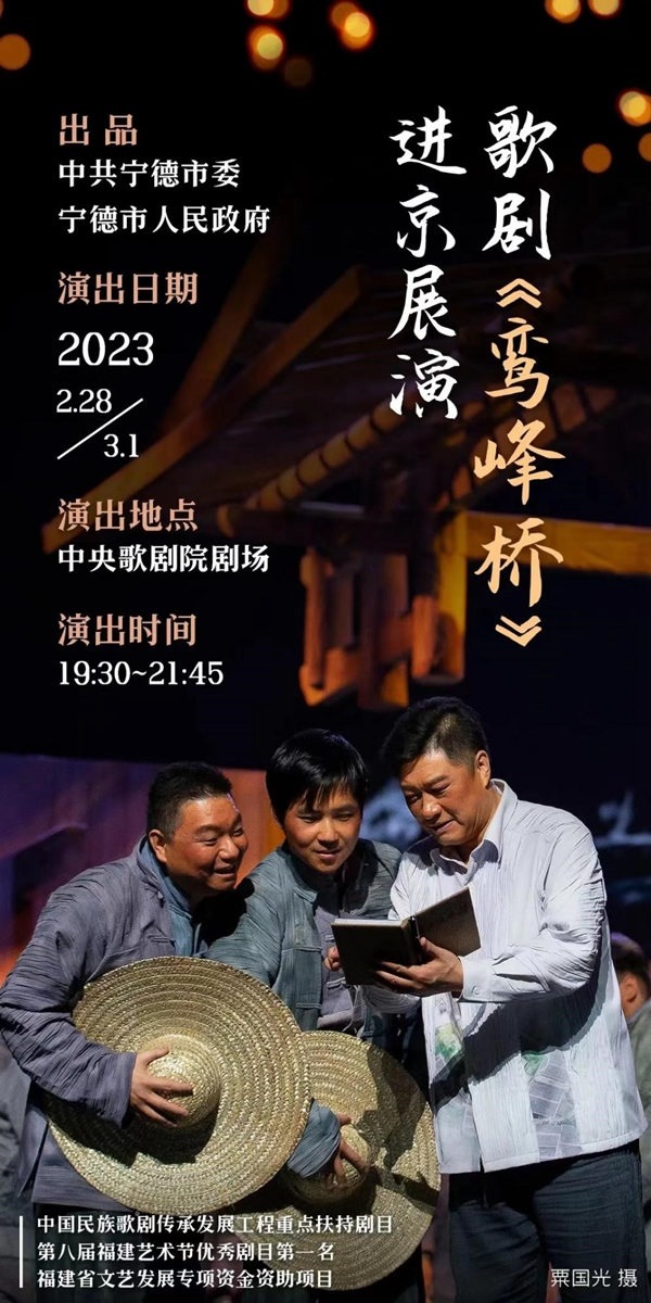 人民網(wǎng)福州2月27日電 (劉卿)日前,文化和旅游部公布“新時(shí)代舞臺(tái)藝術(shù)優(yōu)秀劇目展演”進(jìn)京集中示范演出劇目,由中共寧德市委、寧德市人民政府出品的歌劇《鸞峰橋》入選。據(jù)了解,該劇將于2月28日至3月1日每晚19:30至21:45在中央歌劇院劇場(chǎng)進(jìn)行展演。