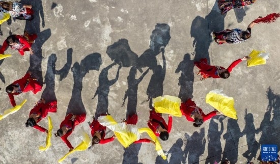 3月2日,當(dāng)?shù)厝罕娕c來自各地的游客踩著相同的鼓點(diǎn)進(jìn)場舞蹈(無人機(jī)照片)。