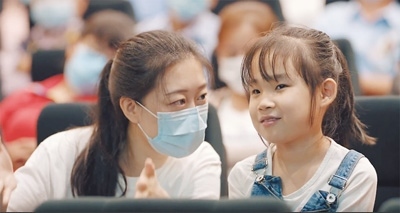 “光明影院”學(xué)生志愿者正在與小朋友交流。