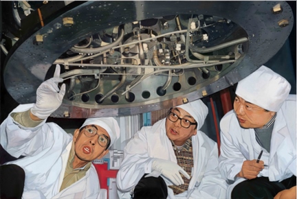 布面油畫《知難而進(jìn) 眾志成城》原型為新華社記者王呈選拍攝的一幅新聞?wù)掌?,畫面?0世紀(jì)80年代末清華大學(xué)核能與新能源技術(shù)研究院王大中、馬昌文、董鐸正在進(jìn)行5兆瓦低溫核反應(yīng)堆調(diào)試的場景。作品生動地刻畫了以國家最高科學(xué)技術(shù)獎獲得者王大中院士等為代表的清華教師勇于承擔(dān)國家重大科技項(xiàng)目,知難而進(jìn)、眾志成城的寶貴精神。