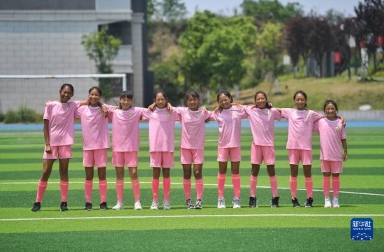來自涼山彝族自治州的9名小球員俄地么你作、舍布么扯鳩莫、候杰欣、吉聯(lián)么李雪、呂小英、趙明練、楊貴洋、拉普么拉扎、楊建鑫(從右至左)在瀘州天立春雨學校足球場留影(5月12日攝)。