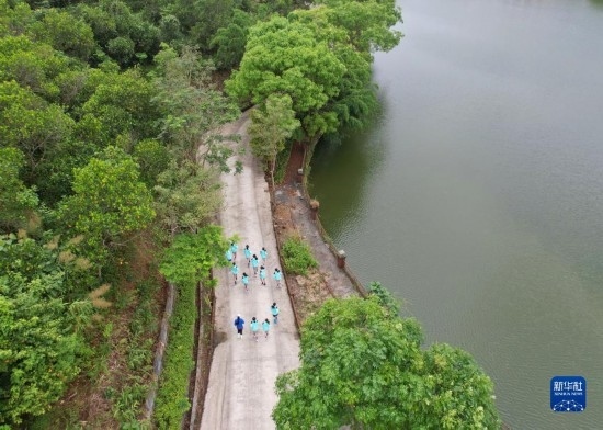 在海南瓊中縣舉辦的中國足協(xié)女足青訓中心“希望杯”U12組比賽的空閑時段,四川隊隊員在賓館內(nèi)部道路跑步(無人機照片,4月10日攝)。