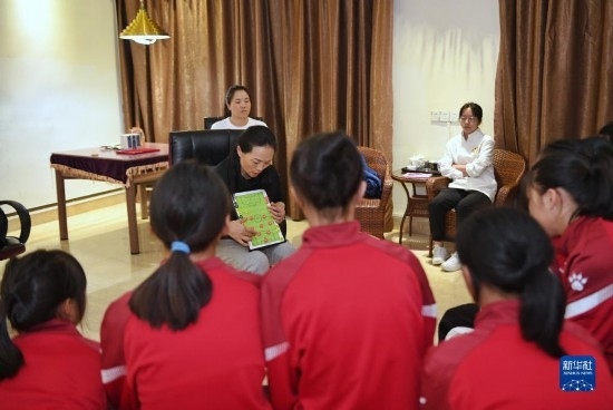 在海南瓊中縣舉辦的中國足協(xié)女足青訓中心“希望杯”U12組比賽的空閑時段,來自涼山彝族自治州的四川隊隊員舍布么扯鳩莫(左二)和隊友們在老師帶領(lǐng)下學習文化課(4月10日攝)。