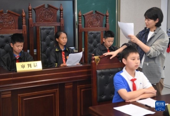 在瀘州天立春雨學校教室,來自涼山彝族自治州的舍布么扯鳩莫(左二)和同學們上模擬法庭特色選修課(5月11日攝)。