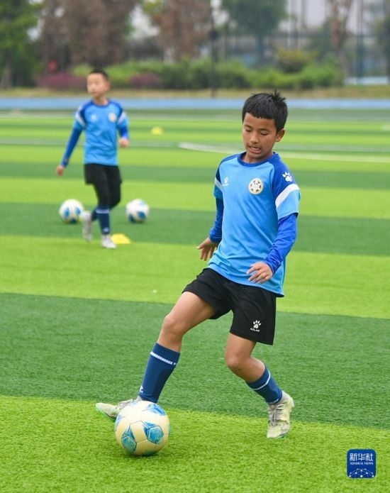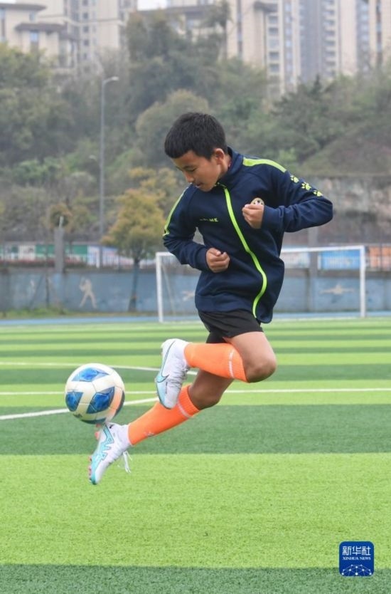 在瀘州天立春雨學校足球場,來自涼山彝族自治州的楊坤在進行訓練(3月28日攝)。