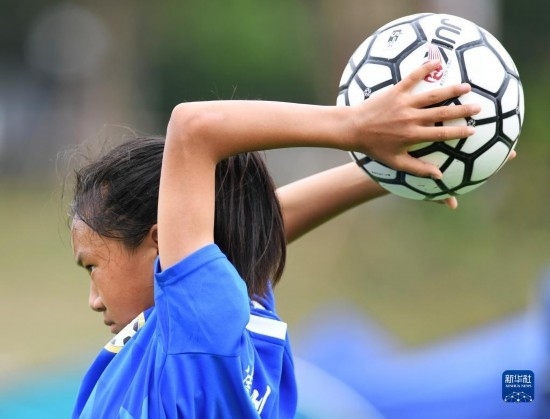 在海南瓊中縣舉辦的中國足協(xié)女足青訓中心“希望杯”U12組四川隊對陣廣東隊的比賽中,來自涼山彝族自治州的四川隊球員舍布么扯鳩莫發(fā)邊線球(4月10日攝)。