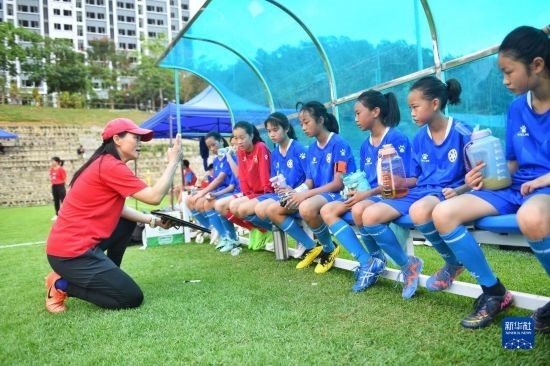 在海南瓊中縣舉辦的中國足協(xié)女足青訓中心“希望杯”U12組四川隊對陣廣東隊比賽的中場休息時間,來自涼山彝族自治州的四川隊隊員舍布么扯鳩莫(右三)與隊友們在聽主教練陳華布置戰(zhàn)術(shù)(4月10日攝)。