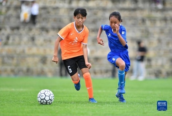 在海南瓊中縣舉辦的中國足協(xié)女足青訓中心“希望杯”U12組四川隊對陣廣東隊的比賽中,來自涼山彝族自治州的四川隊球員舍布么扯鳩莫(右)奮力拼搶(4月10日攝)。