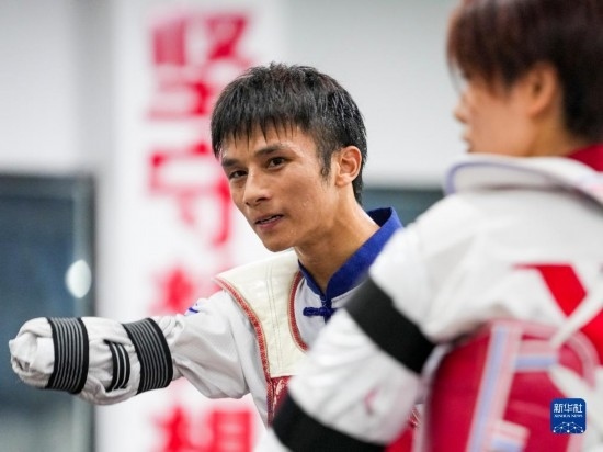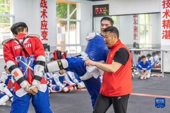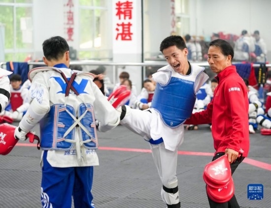 5月19日,在位于重慶市北碚區(qū)職業(yè)教育中心的重慶市殘疾人跆拳道訓(xùn)練基地內(nèi),總教練張銀余(右一)指導(dǎo)學(xué)員郭斌斌(中)進行技巧訓(xùn)練。