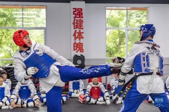 5月19日,在位于重慶市北碚區(qū)職業(yè)教育中心的重慶市殘疾人跆拳道訓(xùn)練基地內(nèi),學(xué)員梁?。ㄖ校┰诮叹氈笇?dǎo)下進行技巧訓(xùn)練。