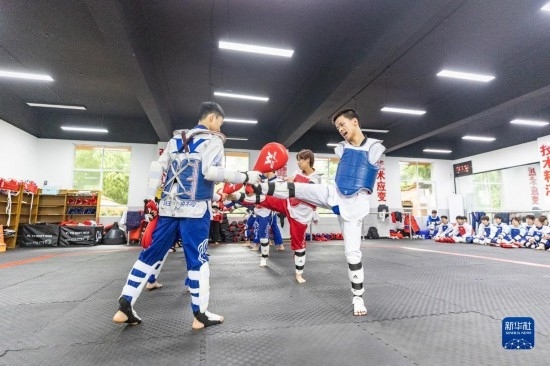 5月19日,在位于重慶市北碚區(qū)職業(yè)教育中心的重慶市殘疾人跆拳道訓(xùn)練基地內(nèi),學(xué)員秦長江(中左)在教練的指導(dǎo)下進行技巧訓(xùn)練。